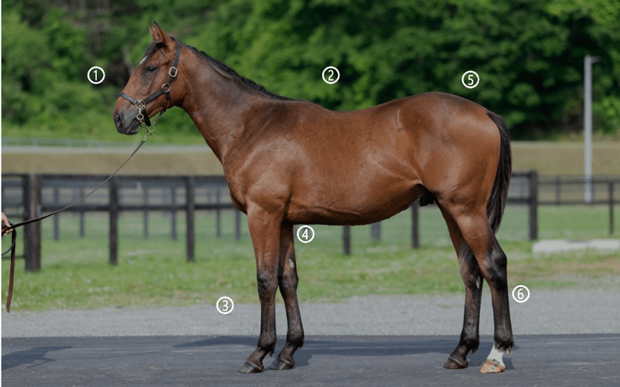 | 飛節(ひせつ) | 後肢の関節で、人間ではかかとにあたる部分です。ここの角度がまっすぐに近い馬を「直飛」、深く曲がっている馬を「曲飛」と呼 びます。直飛の馬は短距離やダート向き、曲飛の馬はストライド が大きく長距離向きとされています。 |