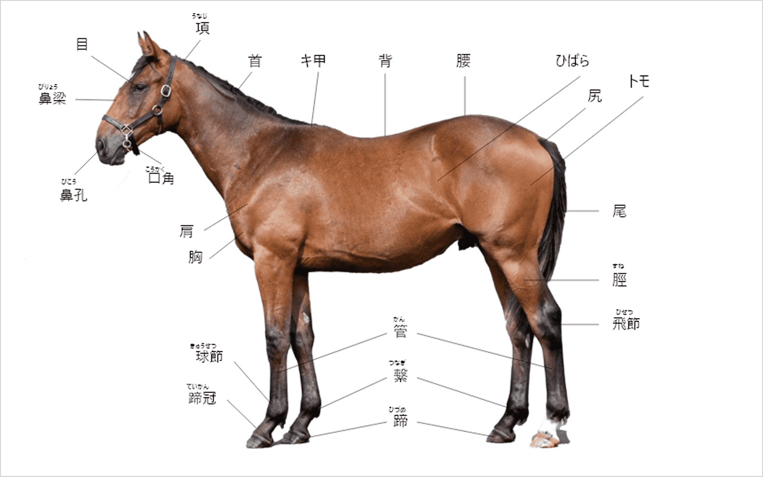 | 尾(お) | 尻尾。筋肉量の多い馬ほど少し離れた状態(尾離れ)になりやすいとも言われています。 |